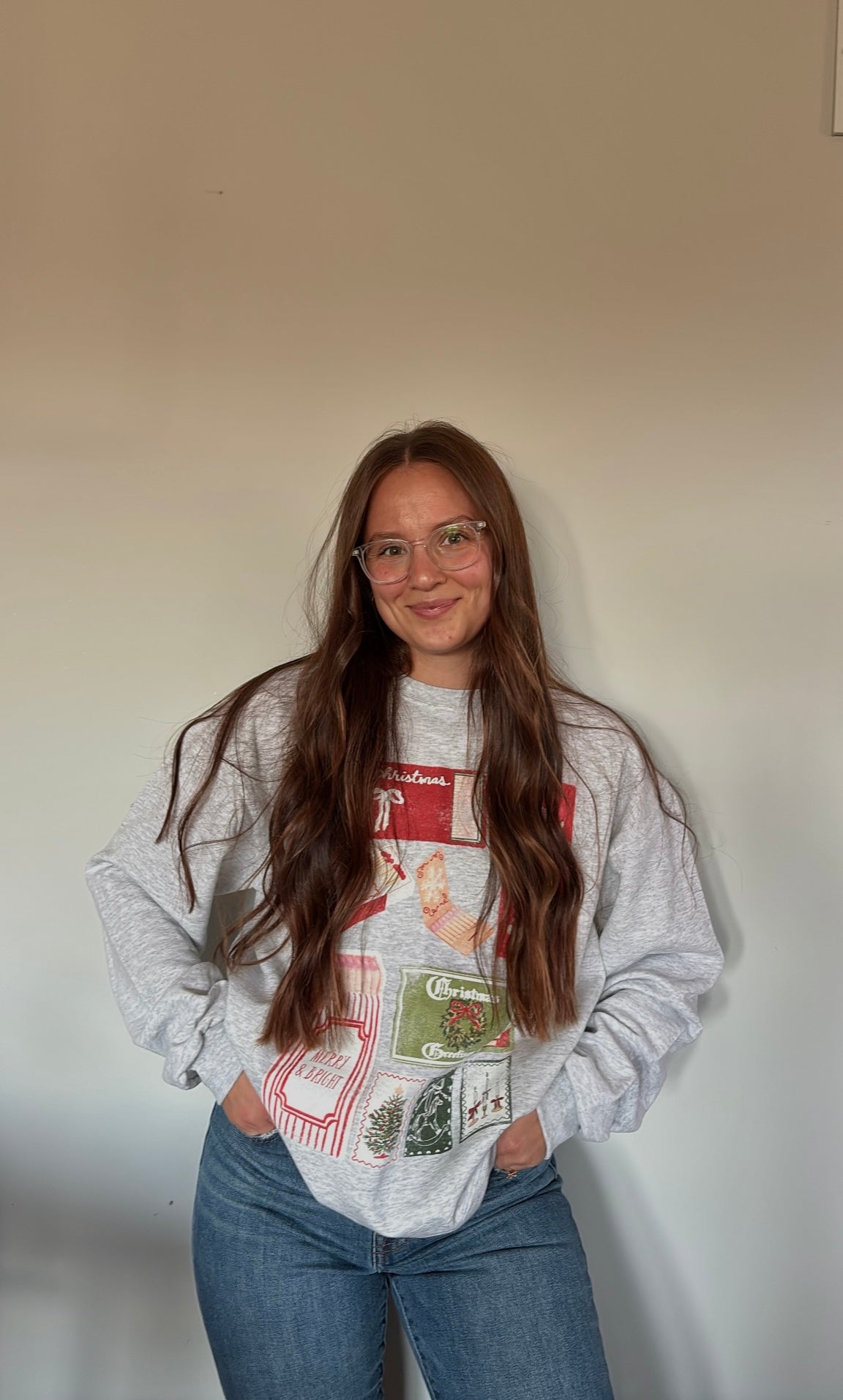 the perfect festive crew neck sweater for the holiday season. Ang is wearing a size medium for a slightly oversized fit.