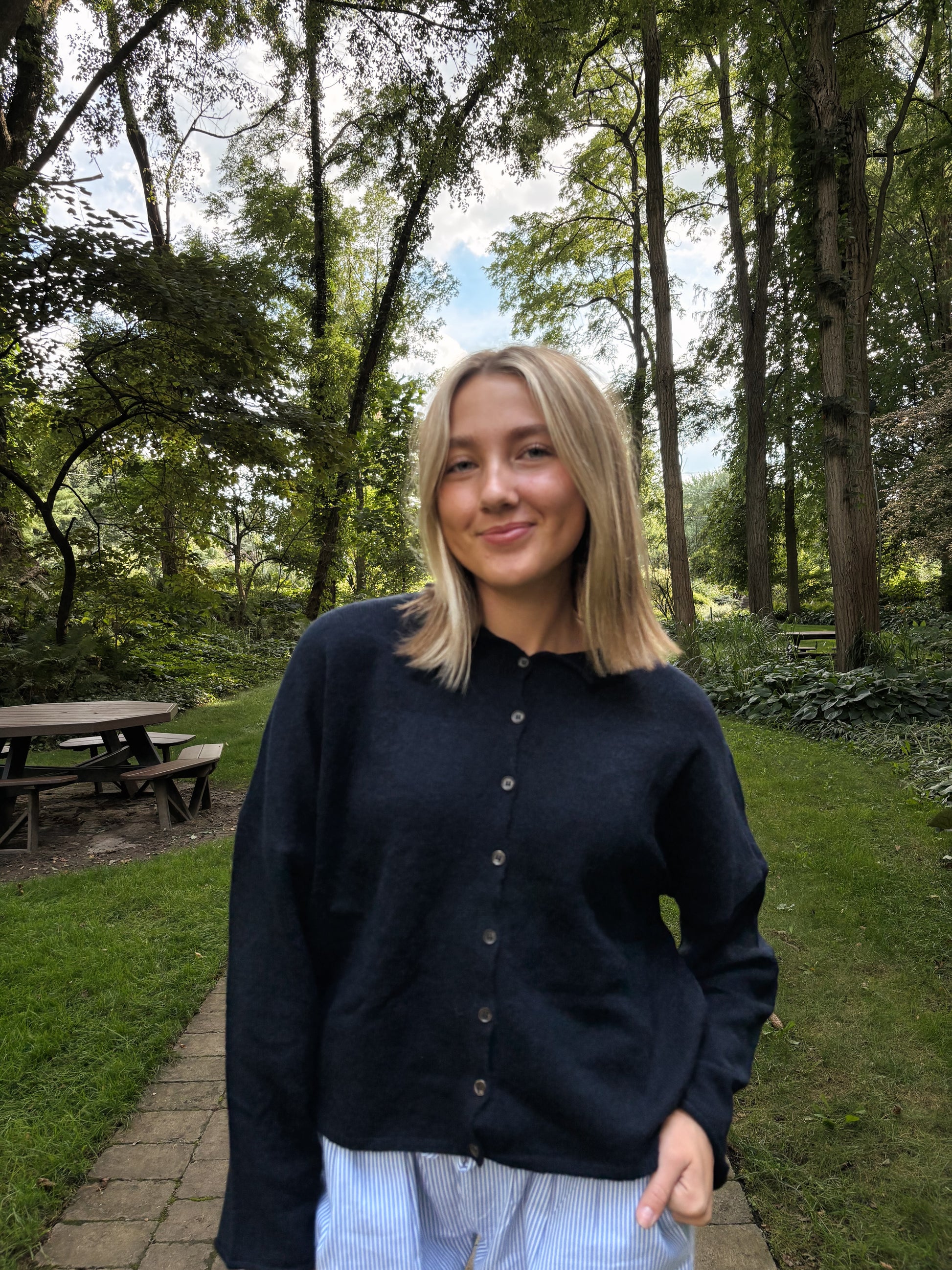 navy lightweight knit cardigan with buttons down the front. Ames is wearing a size small.