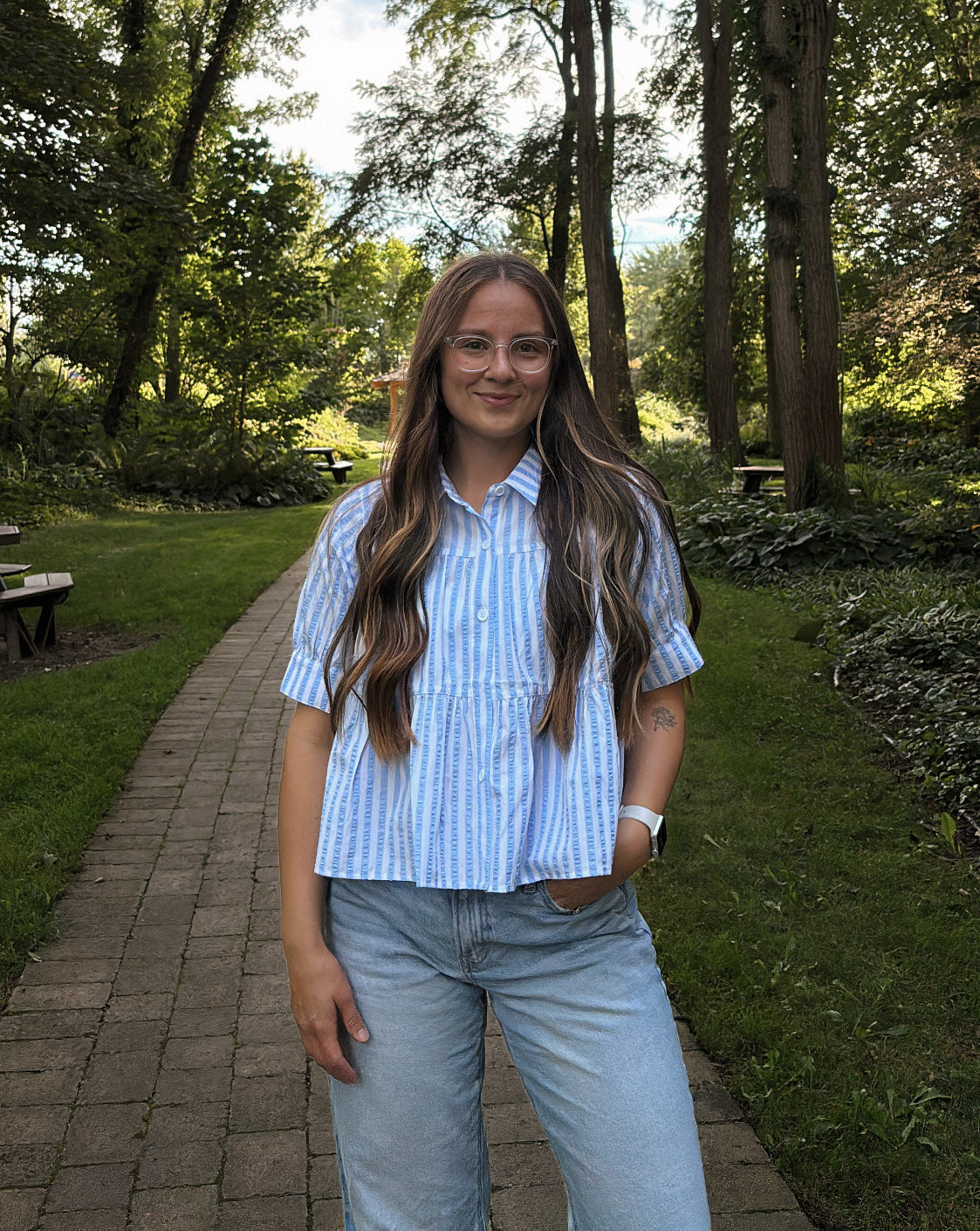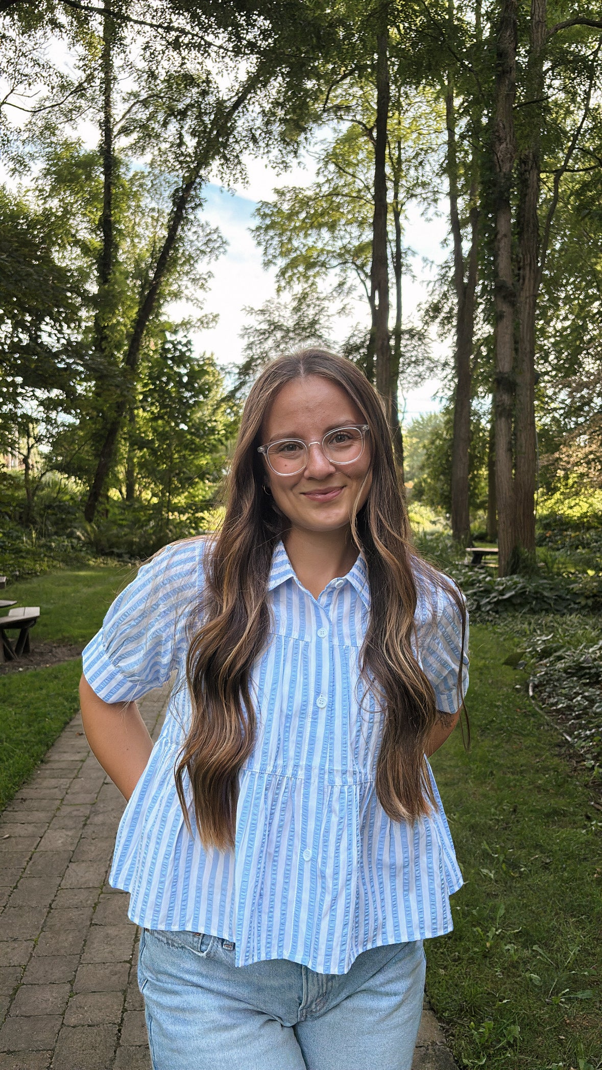 sky blue and white striped tiered button-up collared shirt. Ang is wearing a size small.